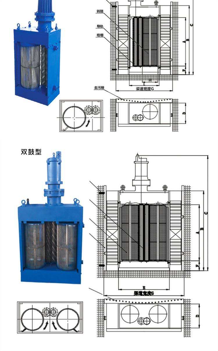 粉碎型格柵由干濕兩用防爆電機、變速箱、變速器、刀片、立式滾筒、密封、安裝支架、溢流格柵、潛水電纜、備用手動格柵等組成的粉碎格柵清洗機。電機啟動后,葉片和立式滾筒以不同的速度旋轉,污水進入滾筒區(qū)并送到切割區(qū)后,旋轉柵格截取污水中的固體浮物。采用差動旋轉的兩組葉片在軸向和徑向快速切割。它被粉碎成6~10 mm的小顆粒,大部分其他污水和足夠小的顆粒直接通過滾筒區(qū)域,破碎后的小顆粒隨著水泵的抽水而流動。