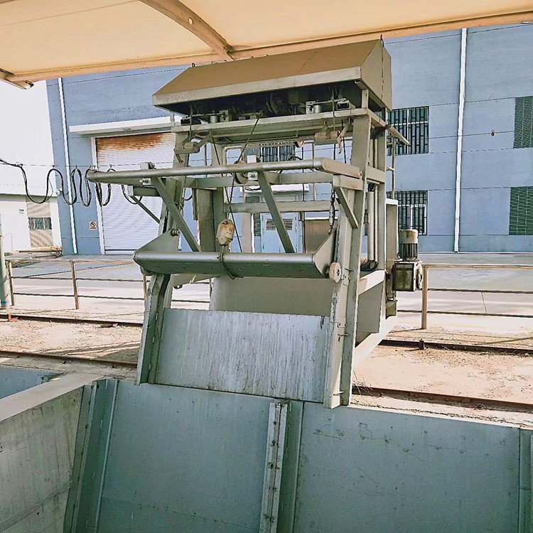 工作循環過程如下:在發出工作指令后,鋼繩驅動裝置開動放繩,耙斗從位置(上一循環撇渣結束處)沿導軌下行,撇渣板在自重的作用下隨耙斗下降。當撇渣板復位后,耙斗在開閉耙裝置(電動推桿)的推動下通過中間鋼繩的牽引張開并繼續下行直至抵達渠(井)底下限位,小車停動而鋼繩松馳,松繩開關動作,啟動電動推桿后縮,放松中間鋼繩,使耙斗在自重的作用下閉合。待耙齒插入格柵間隙后,鋼繩驅動裝置開動收繩,進一步強制耙斗完全閉合后耙斗和斗車沿導軌上行,清除并輸送被格柵攔截的柵渣,直至觸及撇渣板,在兩者相對運動的作用下,柵渣被撇出經導渣板落入盛渣桶(或輸送機),完成了一個工作循環。在工作過程中,如遇意外障礙導致鋼繩驅動裝置過扭,當其扭距達設定值時,即自行報警停機;如耙斗開閉裝置過載,電動推動桿推力上升達設定值時,推桿過力矩開關動作以確保系統安全。